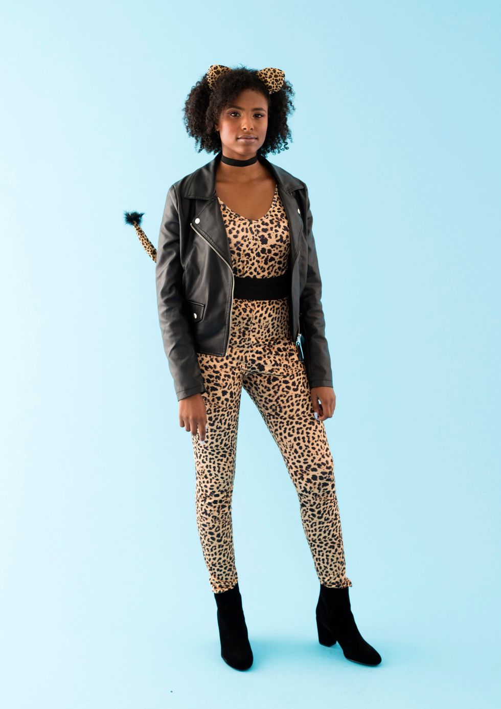 Josie McCoy: The show's songstress has mad cat-titude that's actually pretty easy to mimic. Start with a leopard print jumpsuit ($34), cat accessories ($10), and a faux leather jacket ($50). Complete the look with black booties ($30) and a black choker ($7). You can easily DIY a thick black belt using elastic or velvet. To give the tail more shape, you can add a thick piece of wire (from a hanger). If you don't already have tight, voluminous curls like Josie, consider wearing a wig ($18). Makeup should be natural with a golden highlight on cheekbones and neutral lip color.