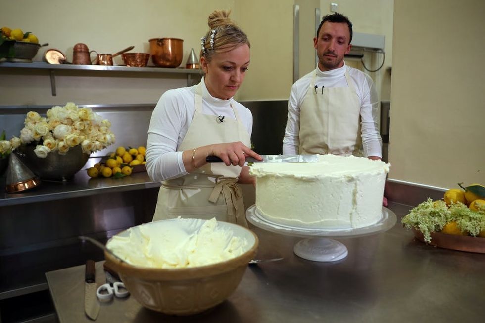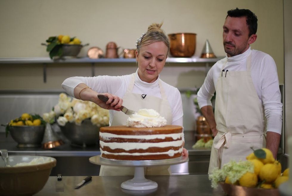 The pastry chefs were photographed decorating one of three cakes they whipped up in Buckingham Palace’s kitchen, a feat which took six people five days to create. Their four-layer creations consist of a lemon sponge base with Amalfi lemon curd filling and elderflower Swiss meringue buttercream frosting.