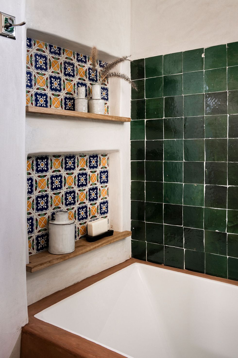 Here's more of that colorful ceramic tile with warm wooden shelving to display bathroom decor.