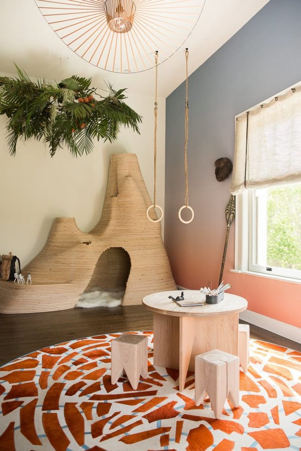 Speaking of fun, the termite mound-inspired reading nook in this room has hanging gym rings perfect for any little monkey. And we are totally digging the hanging greenery above it all.