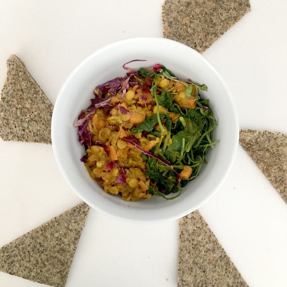 5. Lunch: Lunch is another tasty plant-based meal like rainbow kitchari with gut-healing sauerkraut and mouth-watering chia seed crackers. Other examples include zucchini jicama noodles with a lemon herb dressing, cabbage dumplings in a ginger broth, and a cleansing kale salad. Day four lunch is an alkalizing ginger-carrot soup.