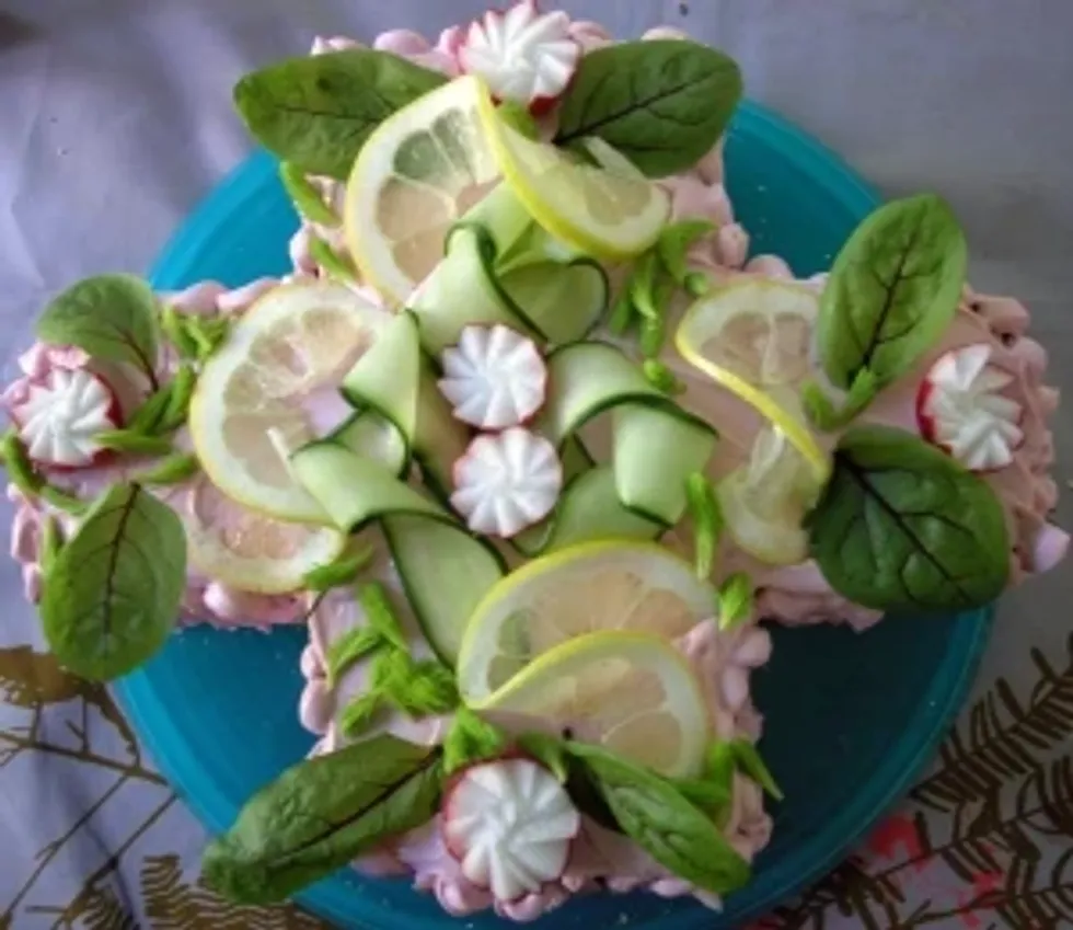 This gorgeous cake would be a stunning main course for a brunch-themed party. Layers of smoked salmon, cucumber and egg are begging to be eaten with a spicy Bloody Mary. Use a cake pan to gauge the size and shape you want your cake to be. (via Pretty Prudent)