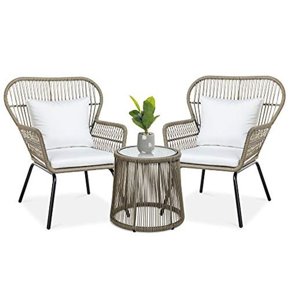 Create a cozy outdoor space with the Best Choice Products Three-Piece Patio Conversation Bistro Set - featuring all-weather wicker furniture, two comfy ergonomic chairs, cushions, and a glass top side table for timeless sophistication.