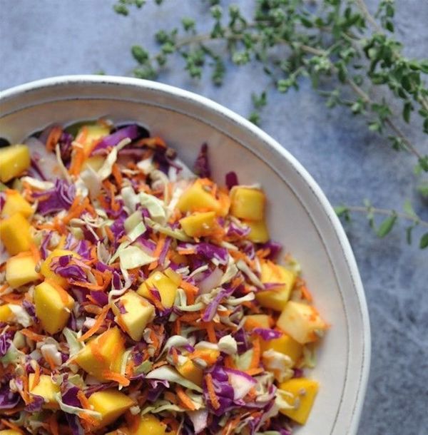 9. Raw Cabbage and Mango Slaw: We love this tropical salad of cabbage and mango. Coconut milk, lime and ginger make up the dressing and sunflower seeds add an extra boost of protein. Now, just picture yourself on a tropical island with this in hand. (via GMOFree Girl)
