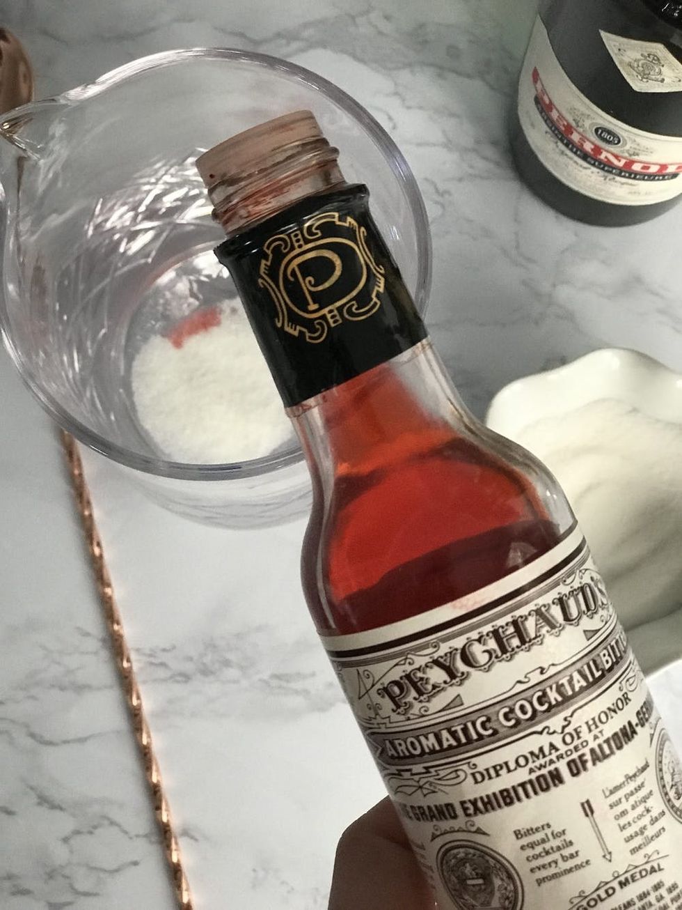 - In a mixing glass, combine sugar, Peychaud’s Bitters, and a few drops of water. Mix until the sugar is dissolved, and add rye whiskey. Add plenty of ice and stir for about 30 seconds to chill.