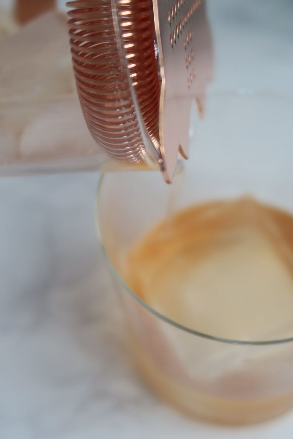 - Remove the chilled glass from the freezer and pour the absinthe or anise-flavored liquor into your chilled glass and rotate until the inside is well-coated. Discard the excess. Strain the cocktail from your mixing glass into your serving glass.