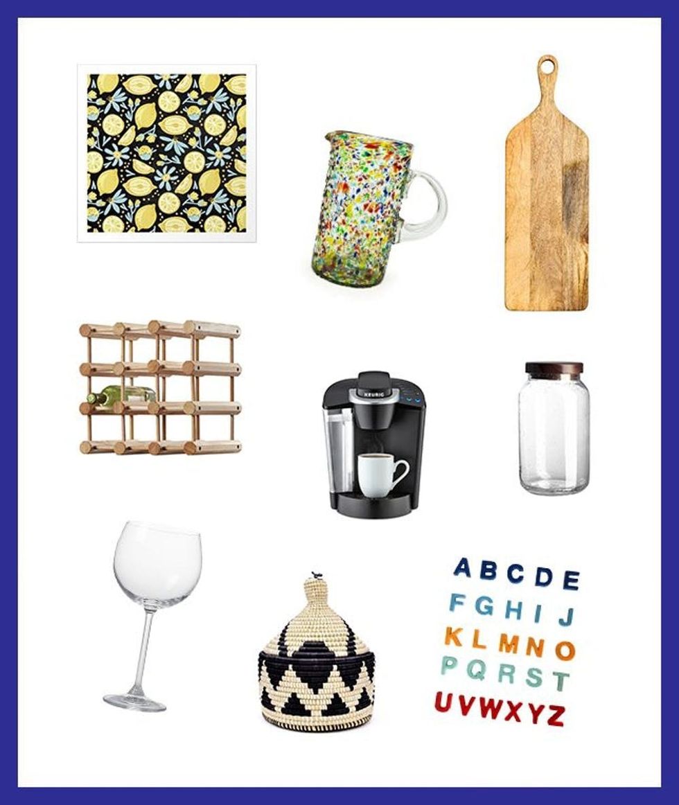 Society 6 Lemon Pattern Black by LaVieClaire ($22+), Bambeco Confetti Recycled Glass Pitcher ($28), H&M Wooden Cutting Board ($18), H&M Large Jar With Wooden Lid ($25), Target Chefmate Alphabet Magnets ($3), Indego Africa Marrakech Neon Basket ($68), CB2 Clarity Wine Glass ($4), Loon Peak Arvon 12 Bottle Floor Wine Rack ($45), Keurig K50 Coffee Maker ($90)