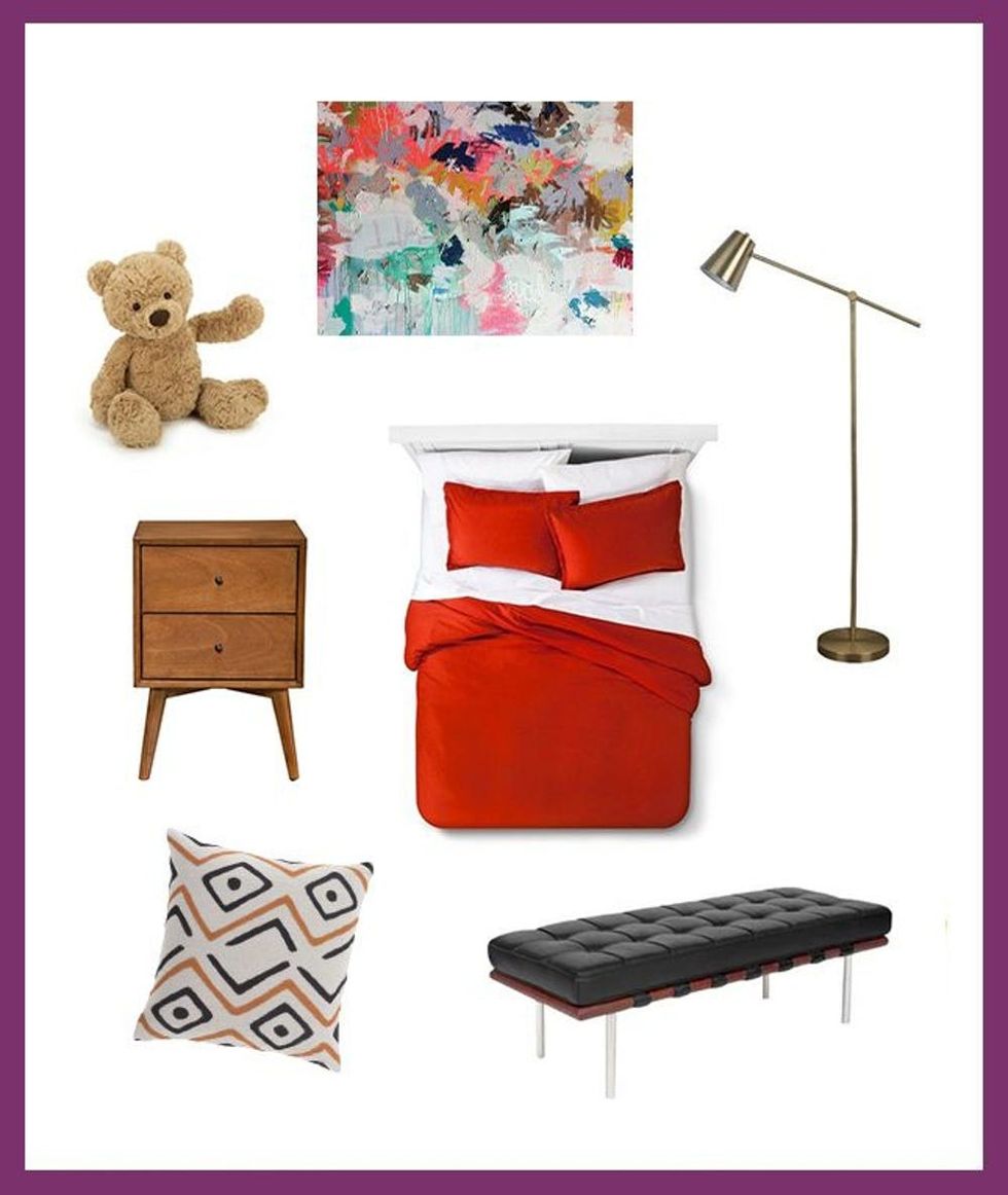 Go bold in the bedroom like our girl with a bright orange duvet set and patterned throw pillows. Keep the rest of the room simple with a wooden nightstand, floor lamp, and black leather bench at the end of the bed. Finish off the space with a quirky art piece and a cuddly teddy bear.