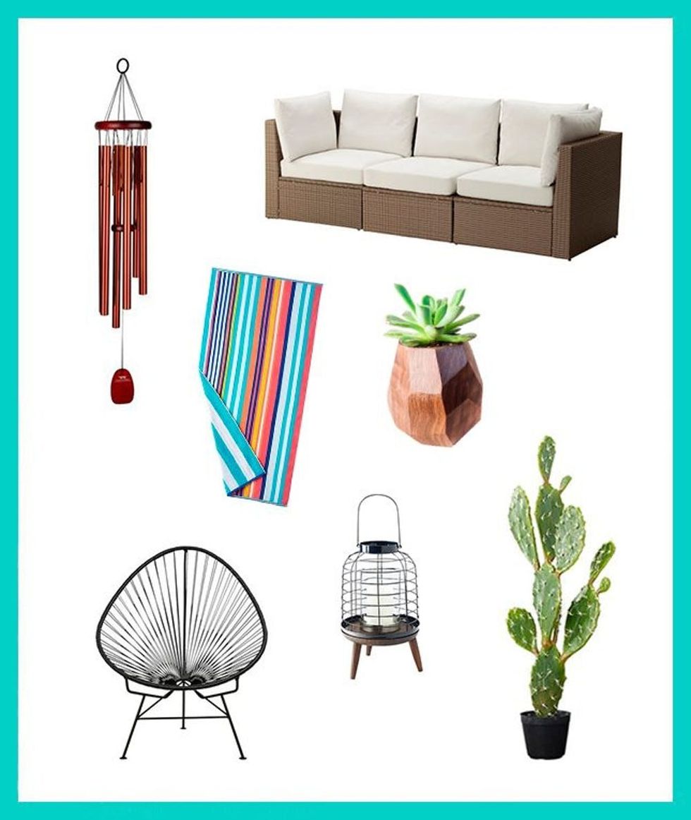 Woodstock Bronze Pachelbel Canon Wind Chime ($60), IKEA ARHOLMA Sofa ($500), Houzz Faceted Geometric Succulent Planter ($50), CB2 Potted Faux Cactus ($90), CB2 Loma Navy Lantern ($100), CB2 Acapulco Black Egg Outdoor Chair ($279), The Big One Stripe Beach Towel ($30)