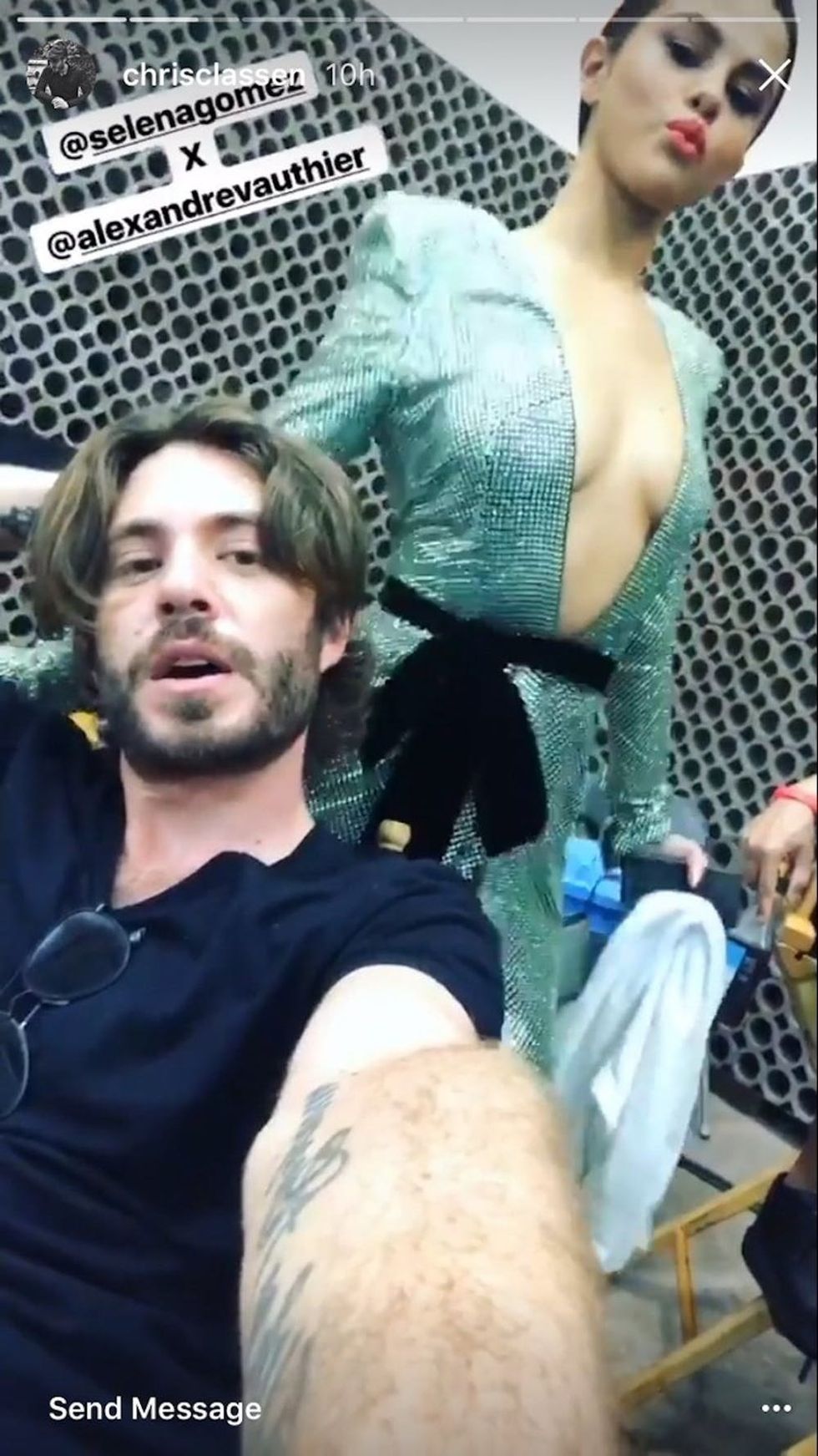 Gomez’s stylist Chris Classen posted a selfie of Gomez via Instagram Stories with the singer wearing a very eye-catching Alexandre Vauthier dress, complete with a plunging neck, a waist bow sash, and plenty of sequins.