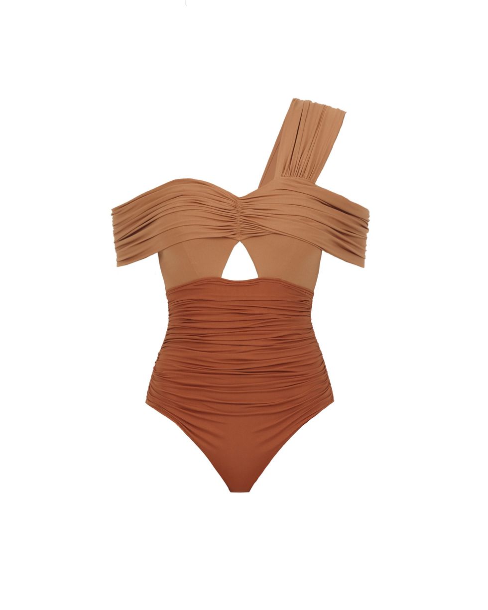 Tan Draped Swimsuit ($290)