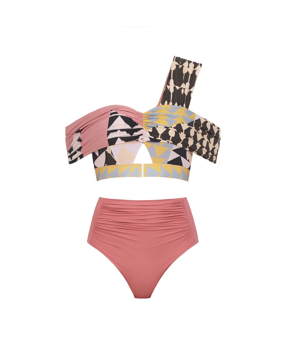 Deco Printed Draped Bikini Top ($238) and Pink High Waisted Bikini Briefs ($66)