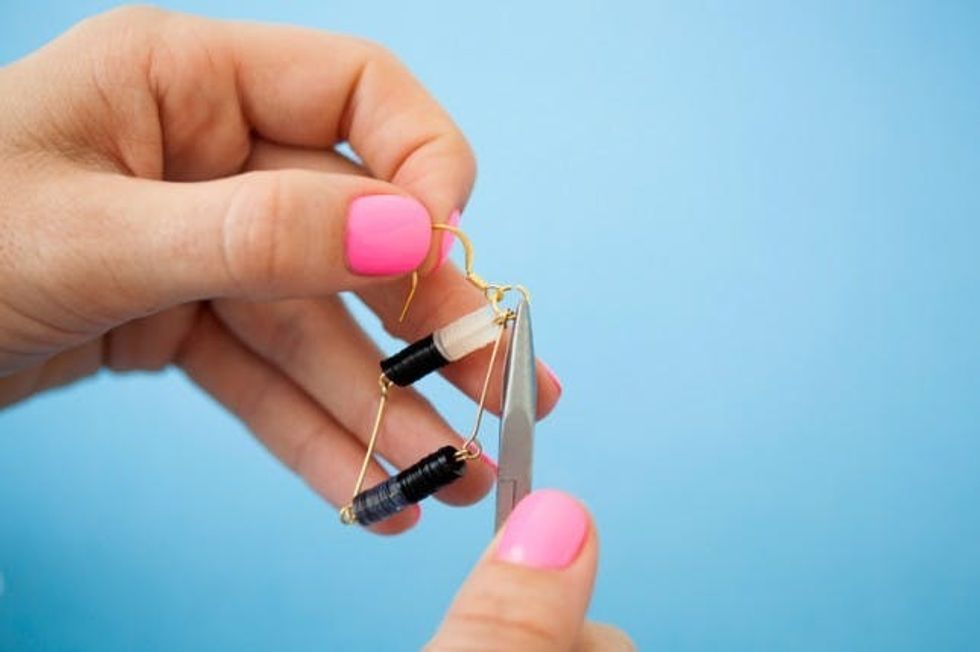 We snipped our first eye pin at 1 1/8 inches long. You can always go bigger or shorter depending on your sense of style. Use round pliers to create another “eye” at the end. Loop your second eye pin through the eye you just created, cut to the same length, and curve into a loop again.