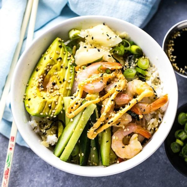 Spicy Sriracha mayo and a variety of textures and flavors make these shrimp sushi bowls a real crowd-pleaser. Creamy avocado, succulent shrimp, crispy nori, and crunchy cucumber make for a refreshingly satisfying meal. (via The Girl on Bloor)