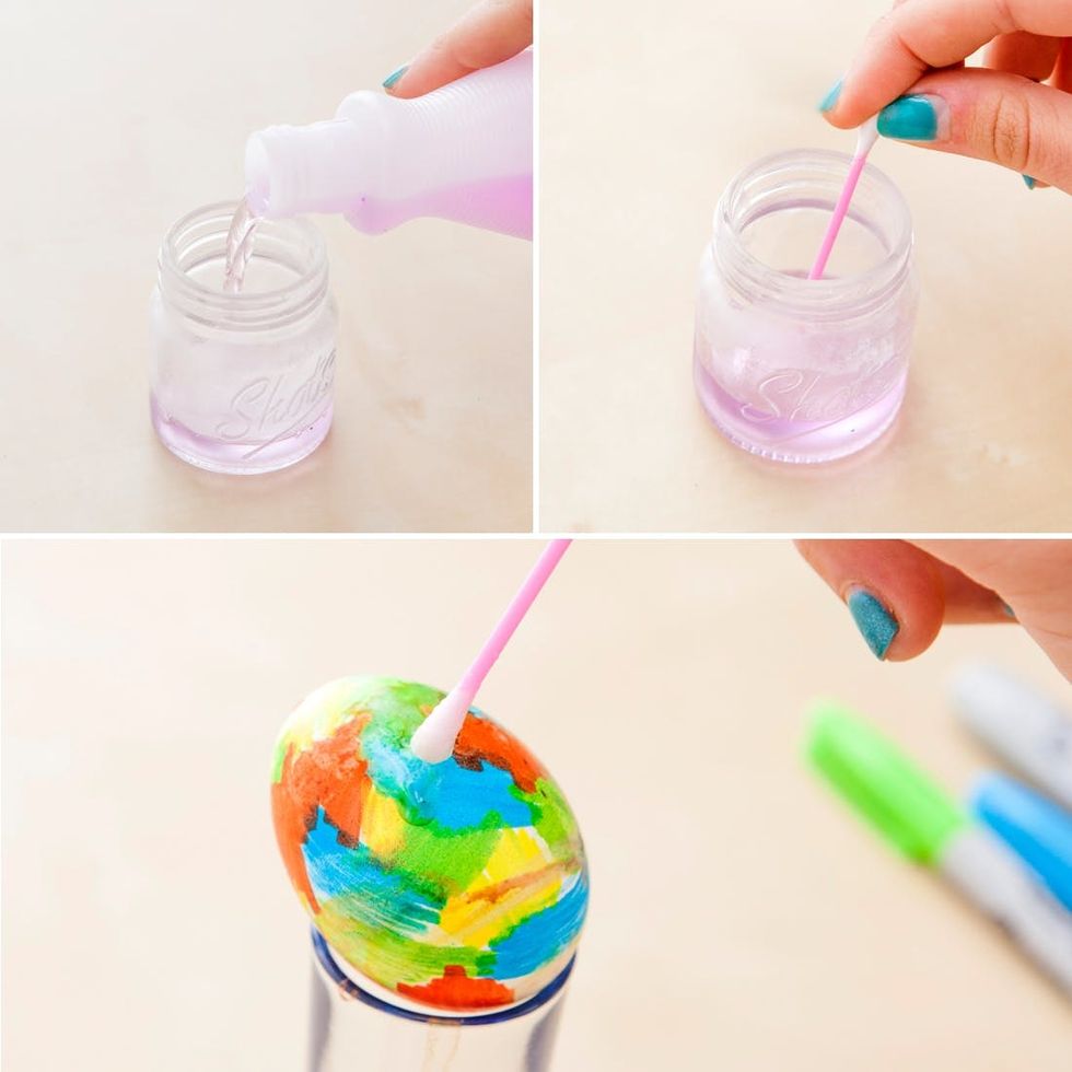 Pour some nail polish remover into a small dish, dip a Q-tip into it, and drip some onto your Sharpie covered egg. Watch how the colors mix and blend together.