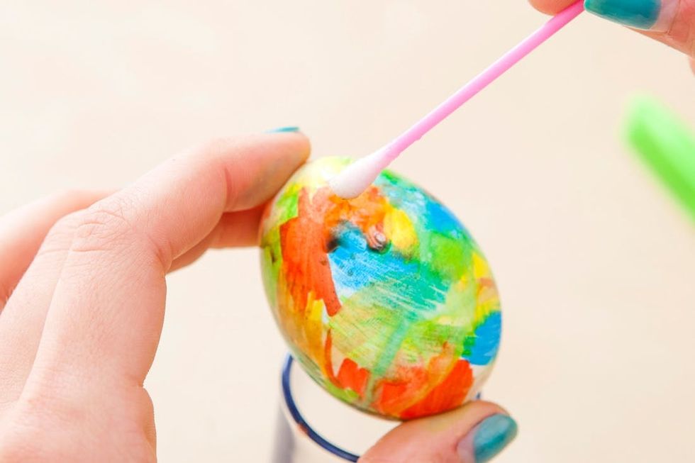 4. Pour nail polish remover into a small container, dip a Q-tip into the container, and dab it onto your egg. Watch the solution drip down the sides and blend the colors.