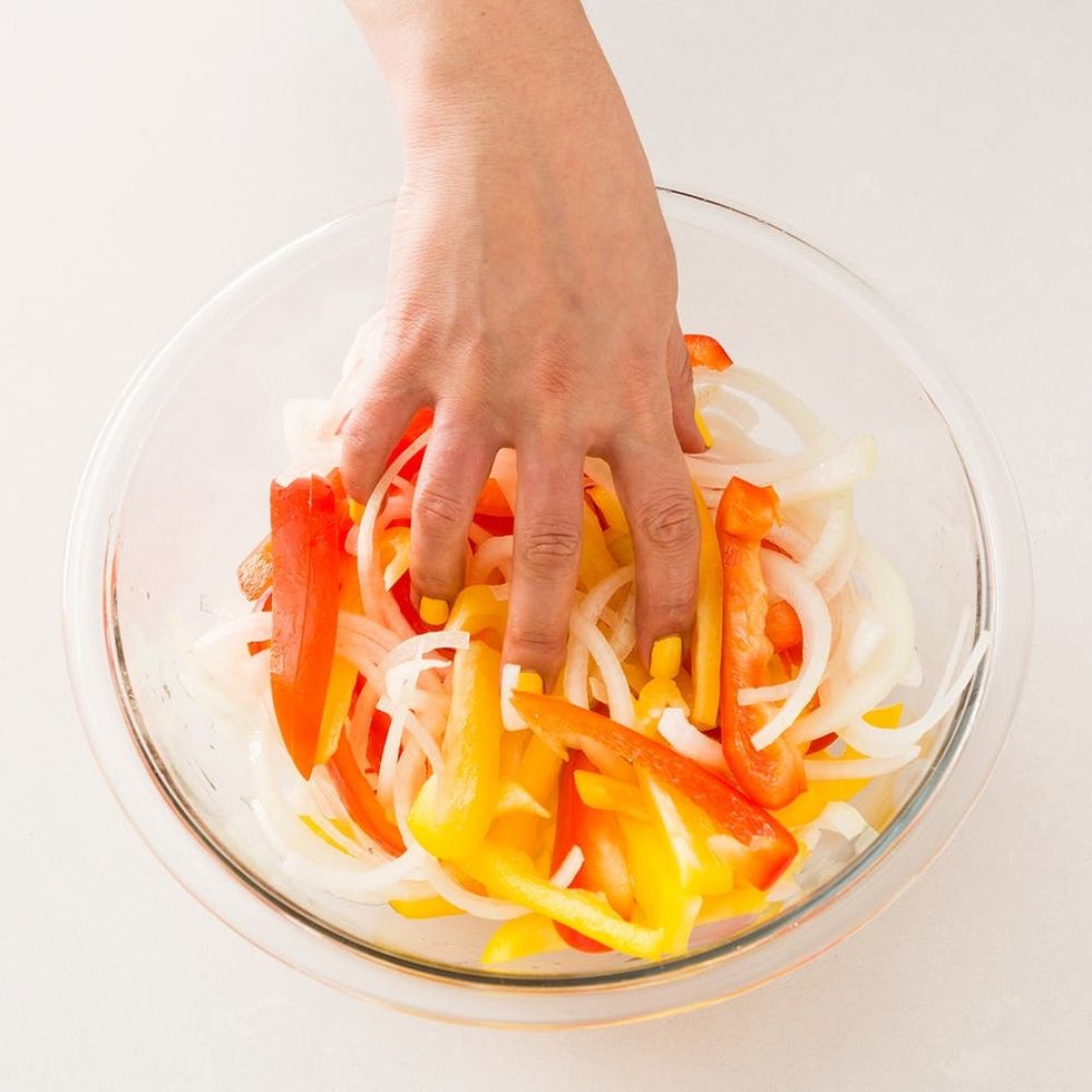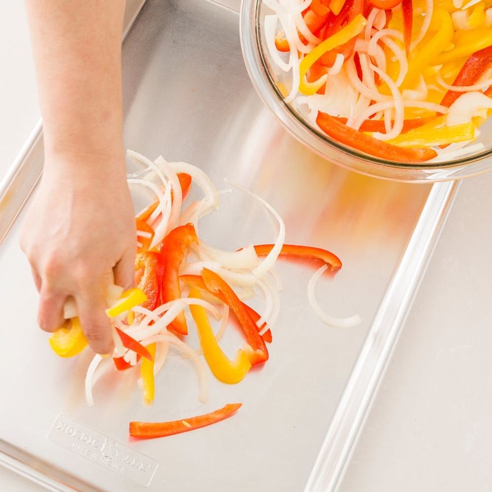 3. Toss the bell peppers and onion into the 2 teaspoons of canola oil until coated. Scatter them onto the sheet pan in a single layer.