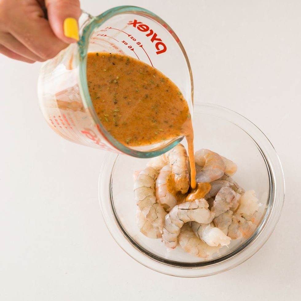 4. Pour the lime juice and garlic into a blender, adding in the remaining oil in a steady stream. Add the salt and spices, pulsing once to combine. Marinate the shrimp, tossing to coat in a large zip-seal bag for 15 minutes.