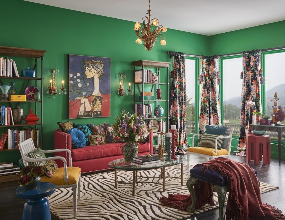 2. Maximalist Greens, Reds, and Yellows: Minimalists, your time is drawing to a close. The fun factor of maximalism, with its bright and cheery prints and super-saturated shades, is just too good to resist. “People are often afraid to embrace big, bright colors in the home,” says Wadden. “This palette is about being carefree and showing a little attitude with unexpected pops of bold color.”