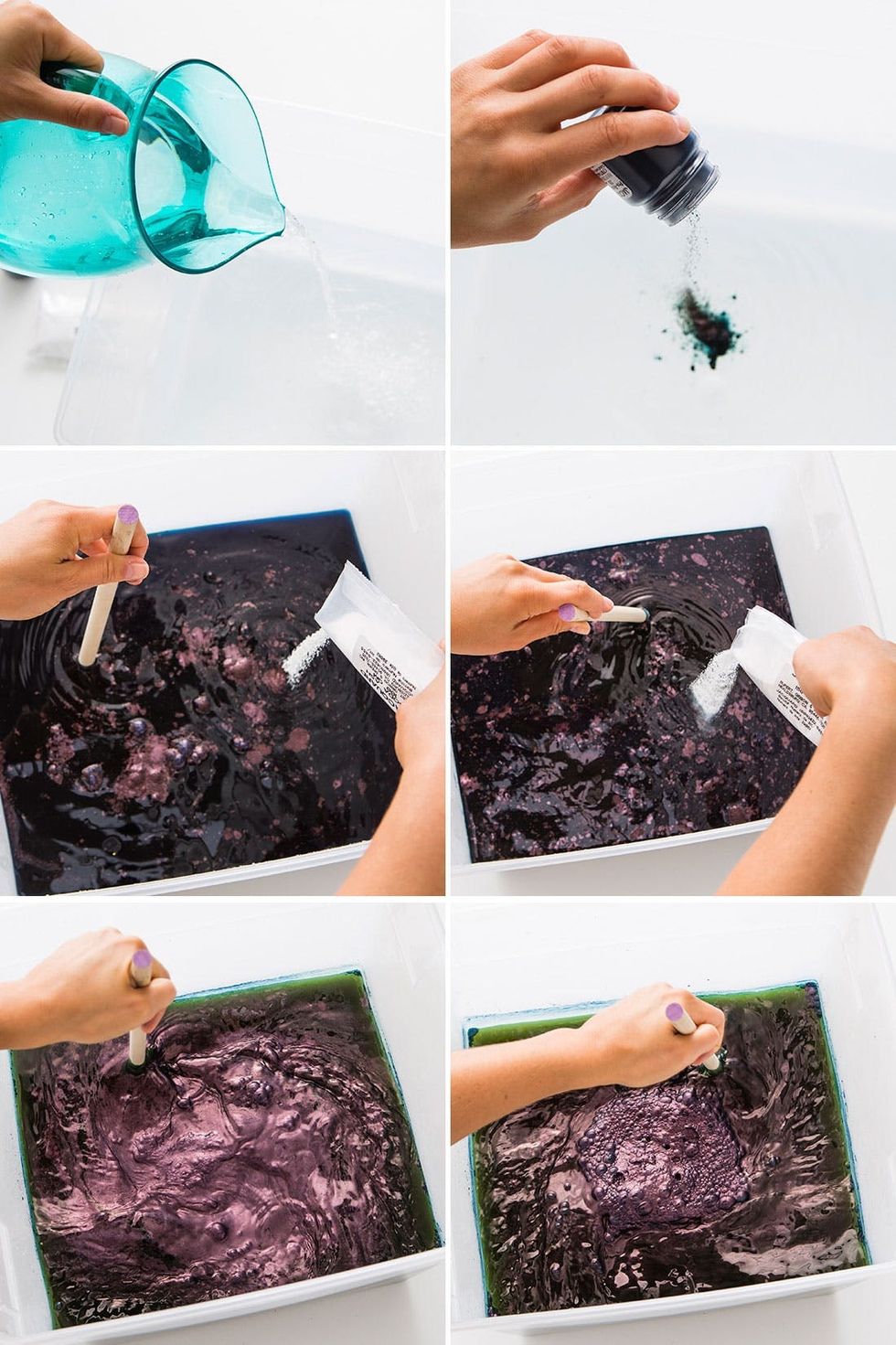 4. Remove the top layer of film from the vat of dye. Save the film — you will put it back in the vat after you finish dying if you want to save your dye to use again in the next few days.
