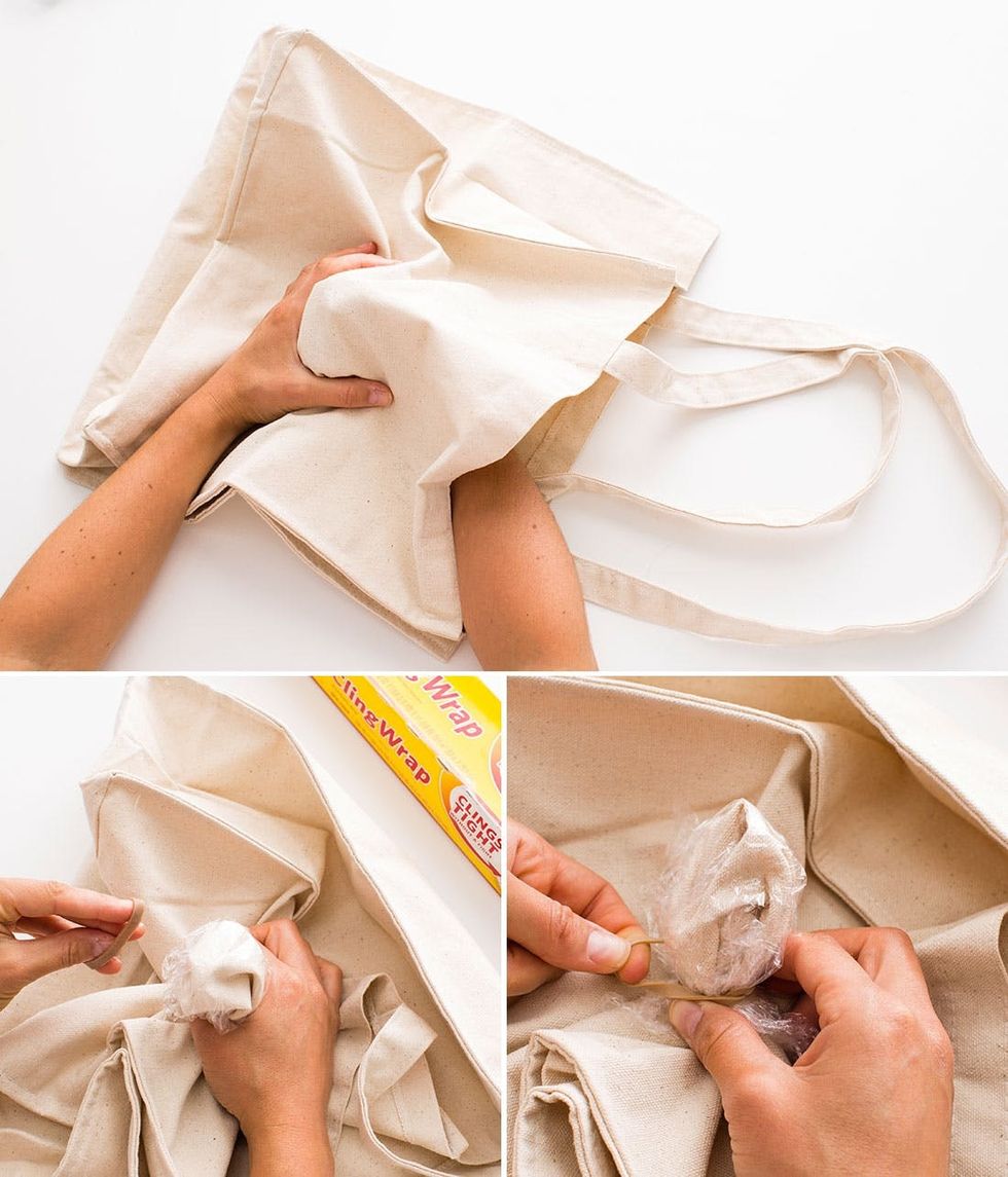 Next up we folded a tote bag. To make a single splotch, cover a fist-worth of fabric with cling wrap and tightly wind a rubber band around the knob of fabric.