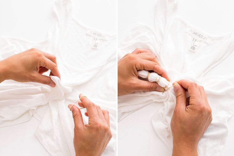Moving on to the tank top. We made concentric circles for this one. You can also use this technique to create multiple circles all over your garment. Grab a bit of fabric at a point and pull it up. Wrap it with a rubber band about an inch from the tip. Keep adding rubber bands moving down the fabric as you go. The further apart you place your rubber bands, the wider your circles will be.