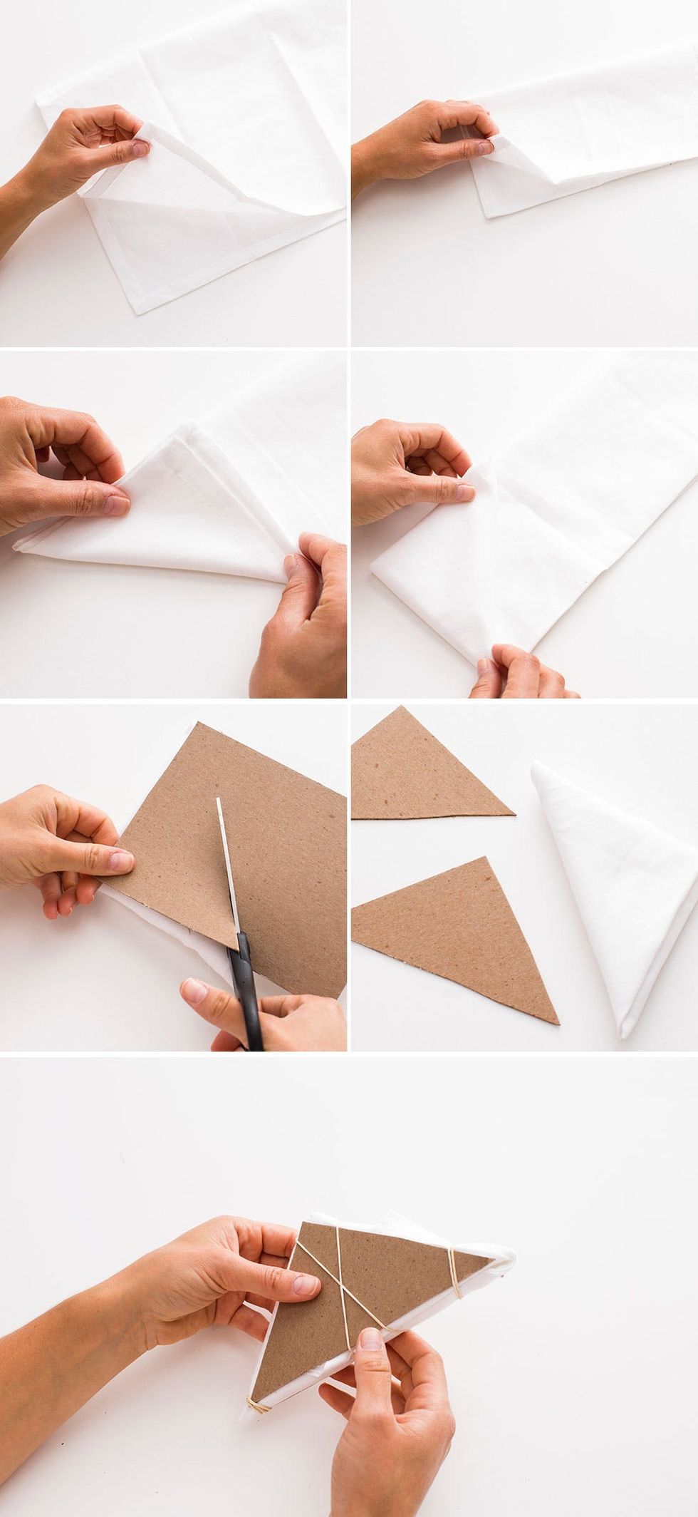 Finally, we dyed a napkin with a triangular pattern. Fold your napkin in half lengthwise and then do that a second time. Now fold the corner on the diagonal creating a triangle. Fold that triangle over itself moving up the napkin until you reach the end. Cut two triangles out of cardboard. These should be the same size as the folded napkin. Place one on each side and add rubber bands to keep the cardboard and folds in place.
