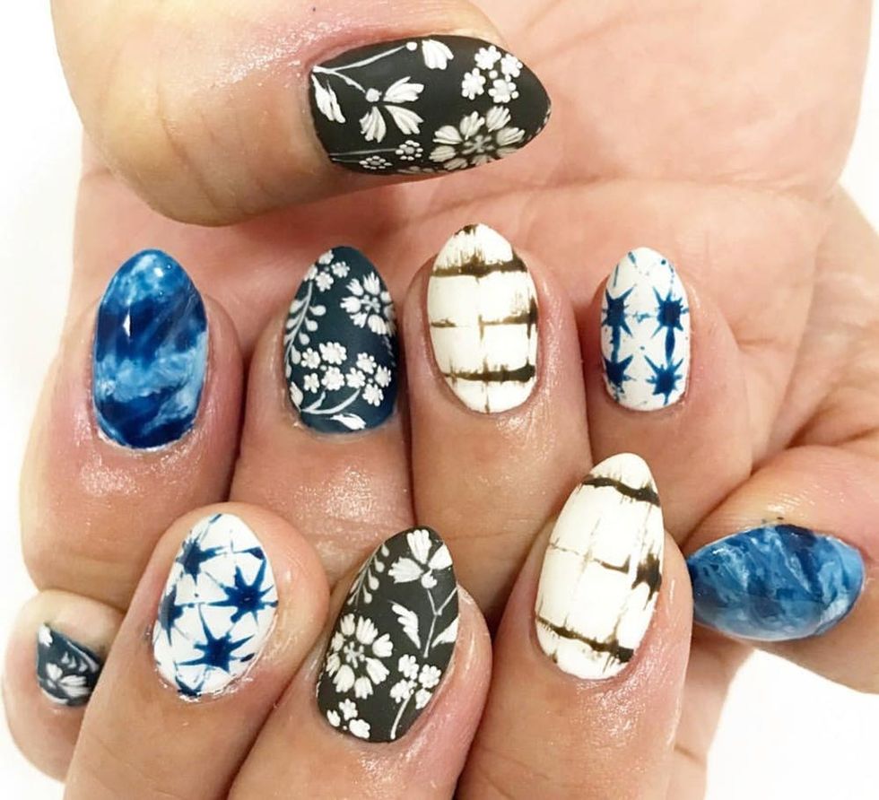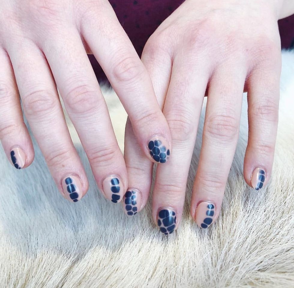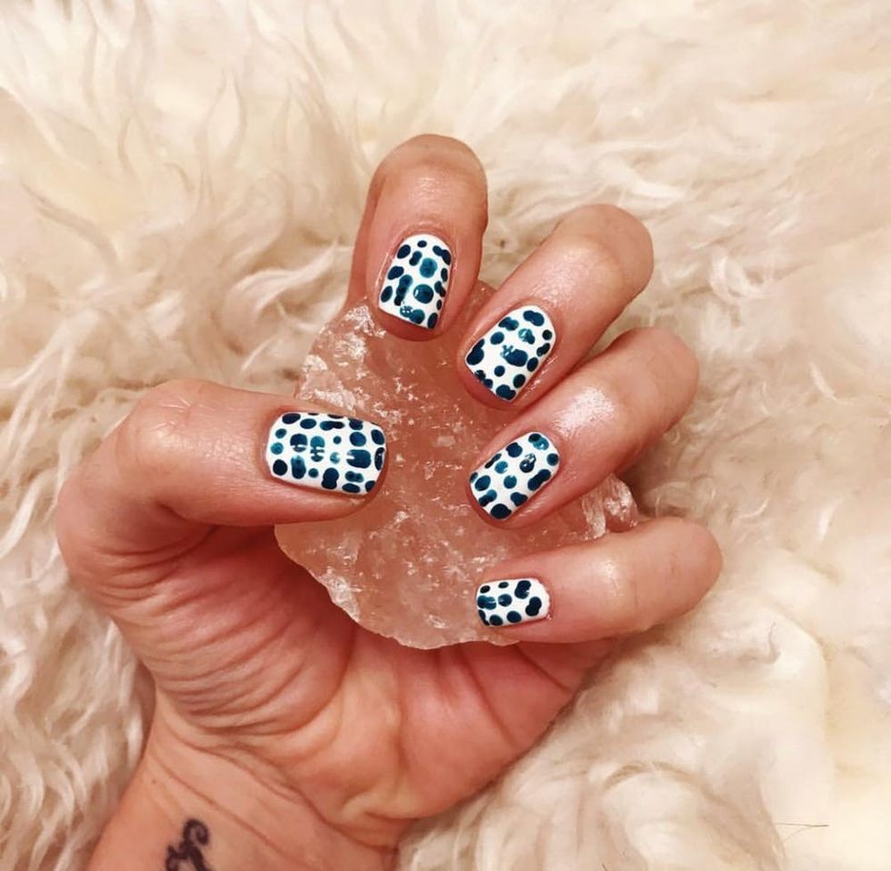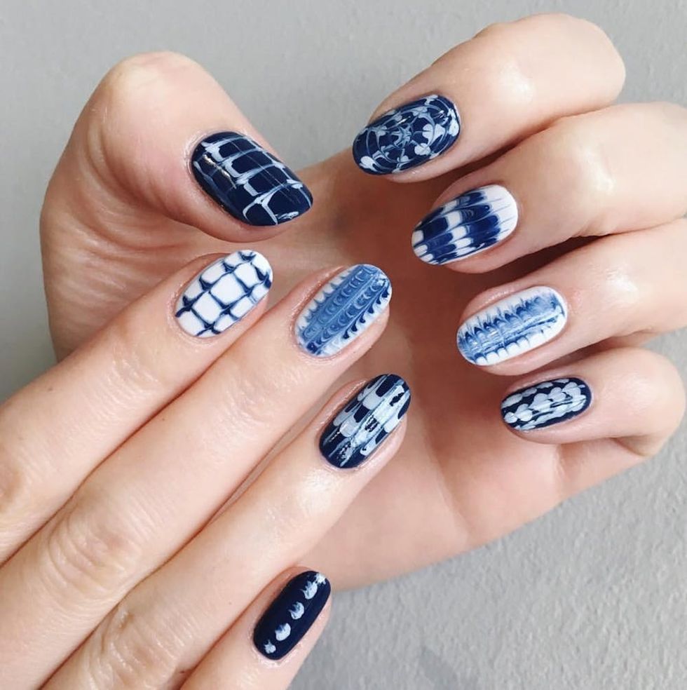Looking for something on the simpler side of the spectrum? Try a sloppy polka dot pattern. Easy enough for shaky hands to master, this technique calls for a stippling tool (or a bobby pin if you want to MacGyver it), white polish, and a deep blue nail tint. (Photo via @jkaquinn)