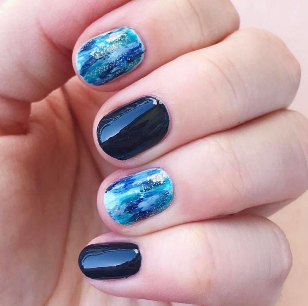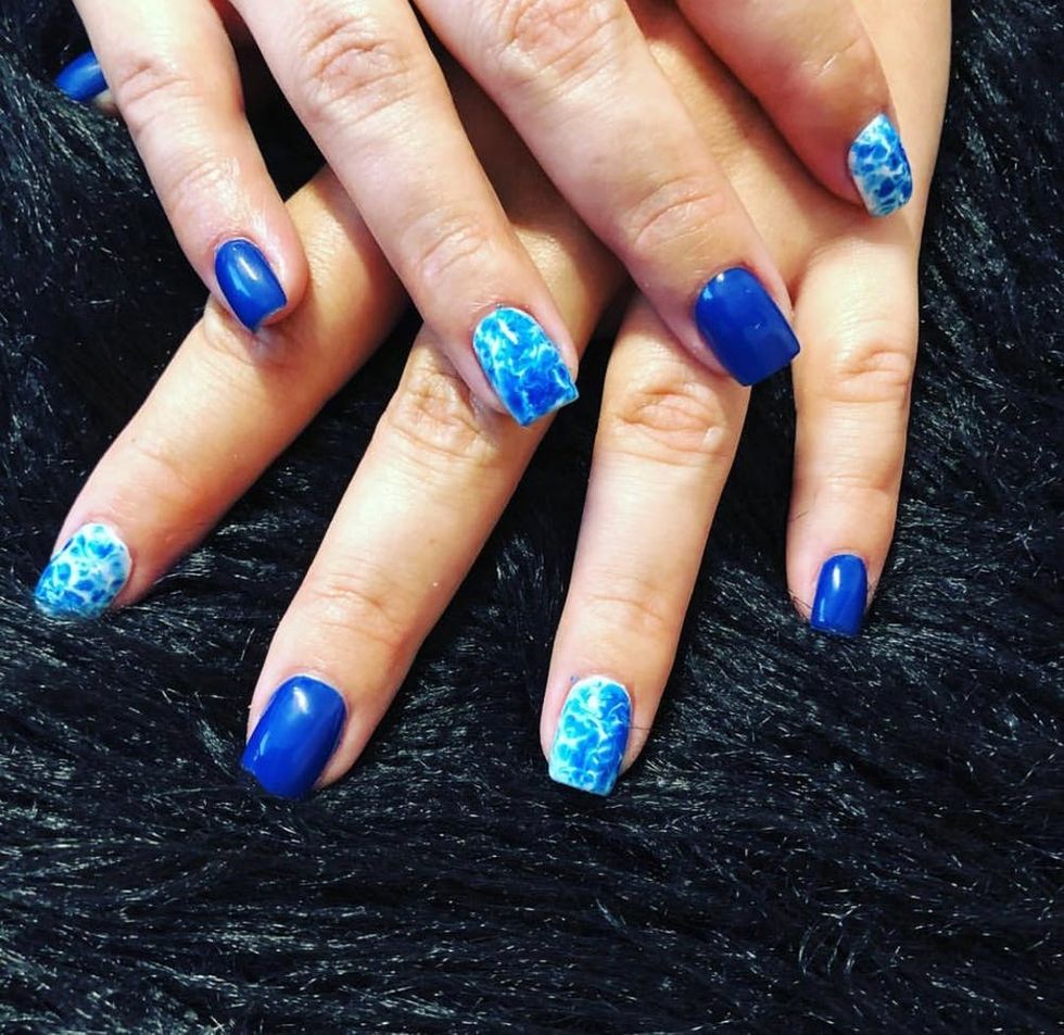 Start by choosing any tint of deep blue (or mix it up with a pastel hue for a softer take) and your favorite crisp white. Paint two layers of your base shade, like white, blue, or a mixture of both. After your base dries, Queenie Nguyen, a manicurist at Olive & June Salon in Beverly Hills, California, says to quickly add a thin layer of the contrasting color. While wet, use a toothpick or bobby pin to gently drag vertical lines through the polish and then pull three to four horizontal lines across the nail. (Photo via via @buffcsjen)
