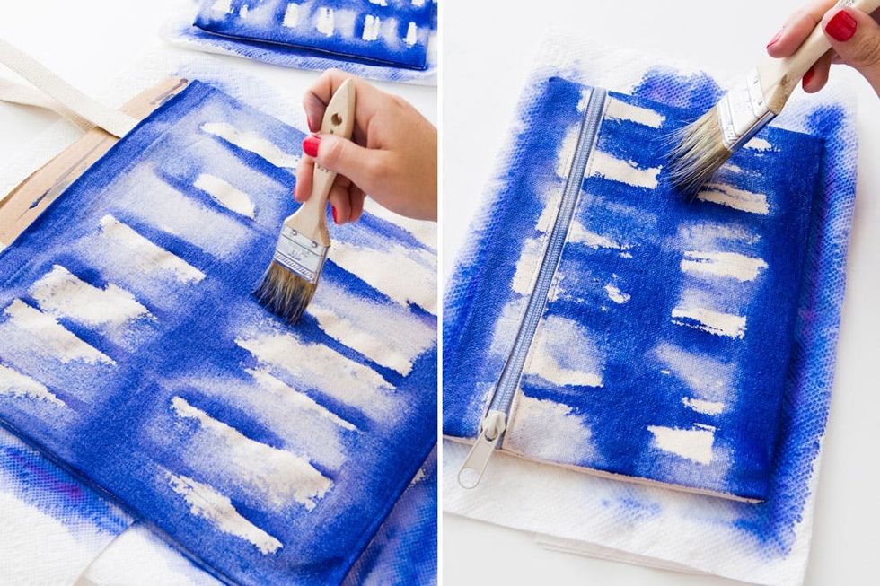 Now go back to your semi-dried tote bag and add more concentrated dye to your horizontal and vertical stripes to make them stand out. You can repeat this on your semi-dried zip pouch as well, and then let both pieces dry overnight.
