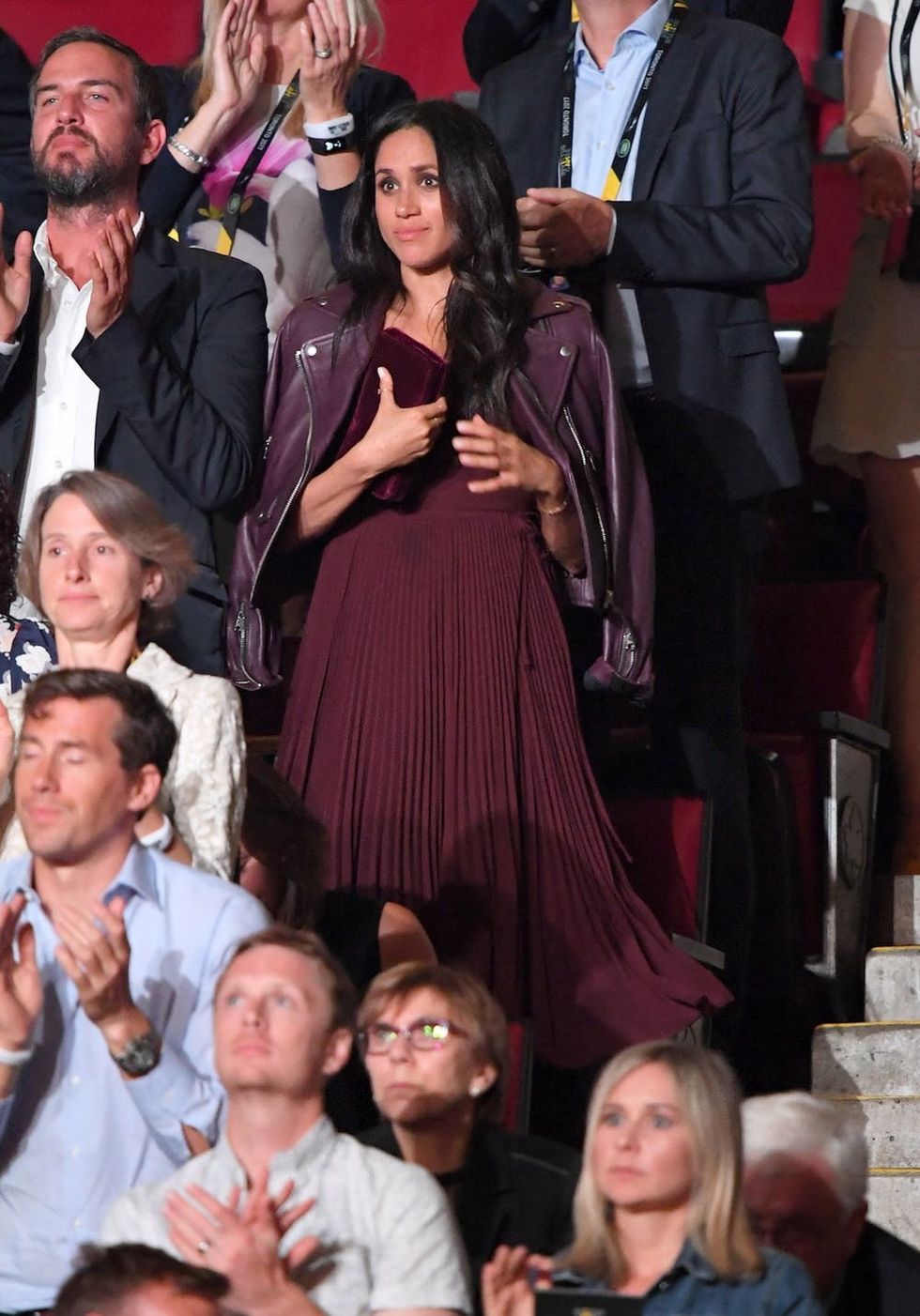At the opening ceremony for the Invictus Games, Markle mastered the monochromatic look in this burgundy dress from Aritzia’s in-house brand, Wilfred, along with another trusty Mackage topper. This girl knows what works for her. (Photo via Karwai Tang/WireImage)