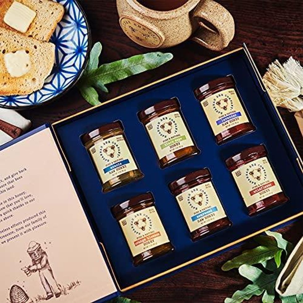 Savannah Bee's Book of Honey is an adorably packaged set of 6 varieties of Honey. A description is provided of "each honey’s taste, what it pairs well with, and its origin." The Book of Honey contains 3-ounce bottles of Tupelo, Lavender, Wildflower, Black Sage, Saw Palmetto, and Orange Blossom Honeys, but "varieties may change depending on the season."