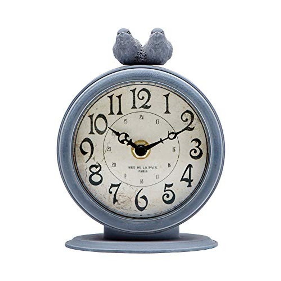 The ideal spot for the Vintage-Style Table Clock would be somewhere that both sides can be easily seen, perhaps on a bedside table. From the front, you can appreciate the adorable birds on top and the shabby chic clock face. The back of the Table Clock reveals beautiful scrollwork.