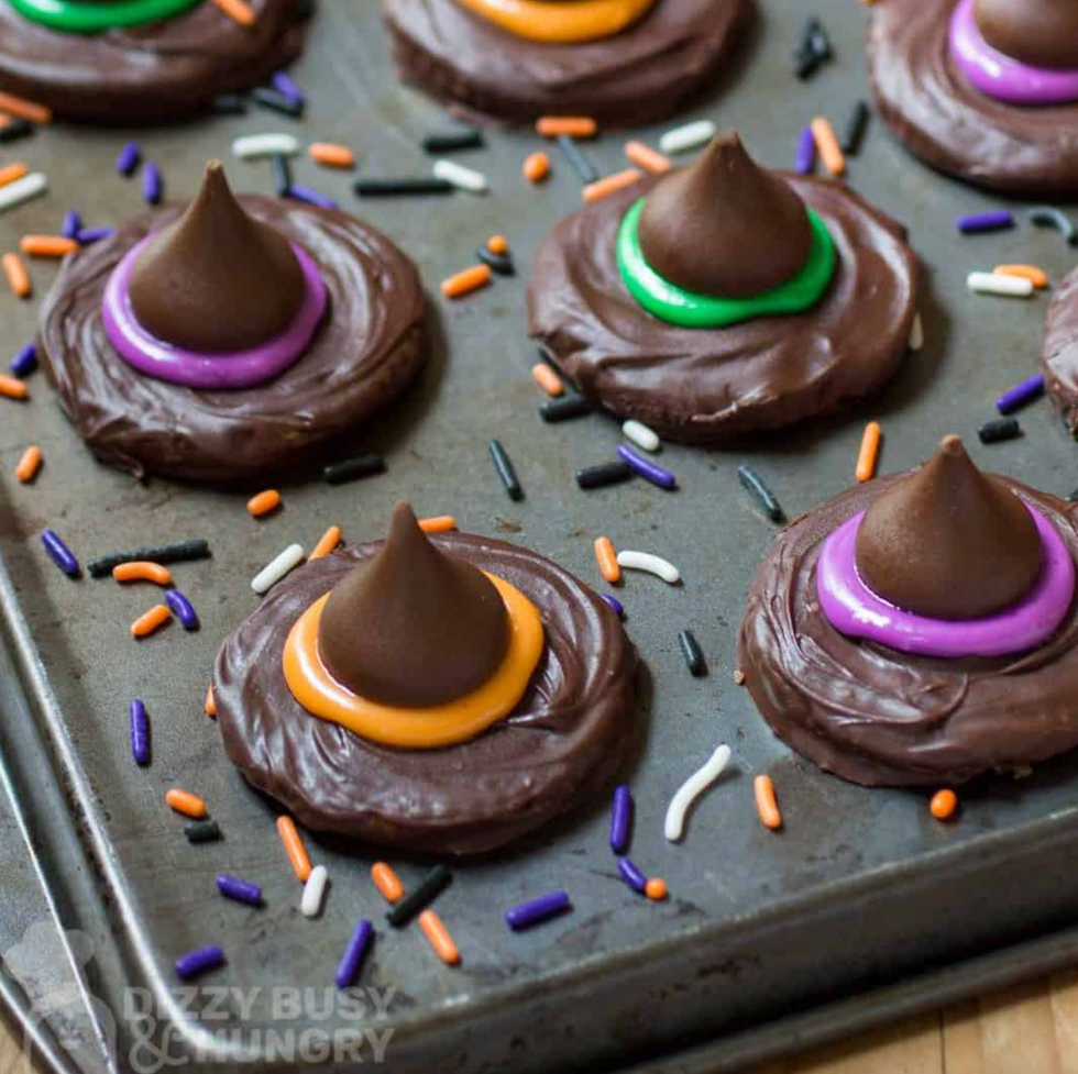 Last but not least, a quintessential Halloween favorite: Things shaped like witch hats. In this case, chocolate kisses sitting atop chocolate-rimmed Ritz crackers. (via Dizzy Busy and Hungry)