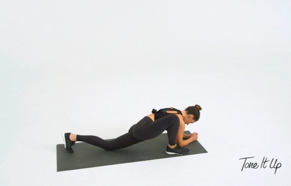 6. Deep Lunge: Step forward with your right leg into a lunge. Drop your back knee and lower your forearms down to the ground. Stay in this position for a few seconds, then move into pigeon (directly below), before switching sides.