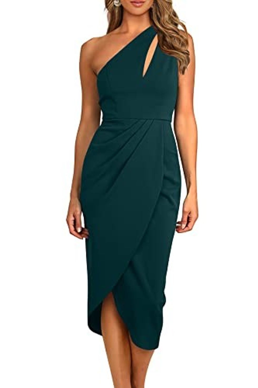 Sometimes, the weather isn't perfect for wearing a long dress without overheating throughout the event, and that's why this midi dress is the perfect solution. It features a formal design that will keep you within the dress code while providing a more comfortable feel. With a one-shoulder strap, a classy cutout, and a skirt that has a wrapped appearance, it's both stylish and practical.