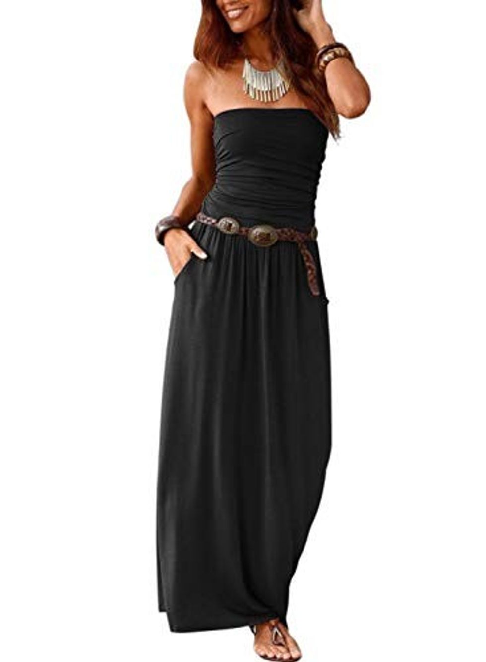 Simple is sometimes better; this tube top dress proves that. This dress is easy to pull on and doesn't feel like you're wearing much of anything at all. But despite being a tube top, it's still a maxi dress and brushes the floor to give you full coverage of your legs for a bit of a different look from top to bottom.