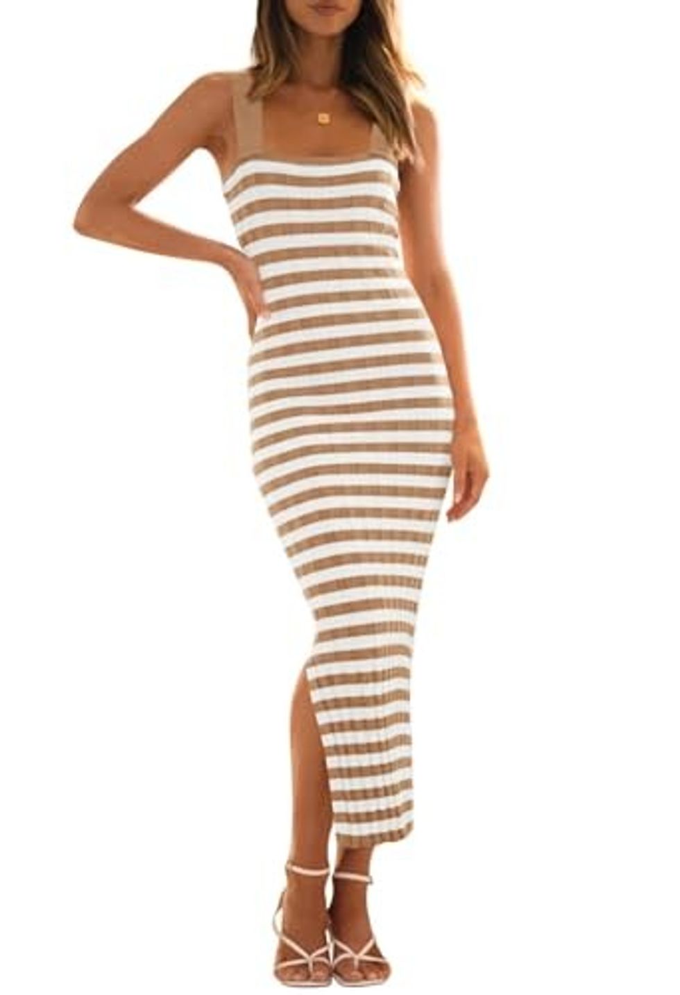 Not all bodycon dresses need to be revealing and fancy; they can be more laidback and fun, like this tank top bodycon dress with the fun slit up the side. It's striped and fun and comes in all sorts of great colors, so you can find just what you want to match your summer style. Plus, you can style it well into the fall.