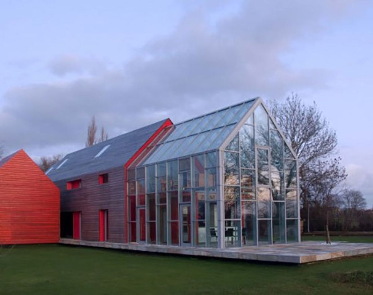The owners love their rural setting and wanted the home to reflect the farm buildings that surround it. Made from local timber, red and black stained larch and glass, the house is defined by materials and color. Fun fact: The distinctive red timber was designed to look like a Monopoly hotel piece and helps to insulate the house during the winter.