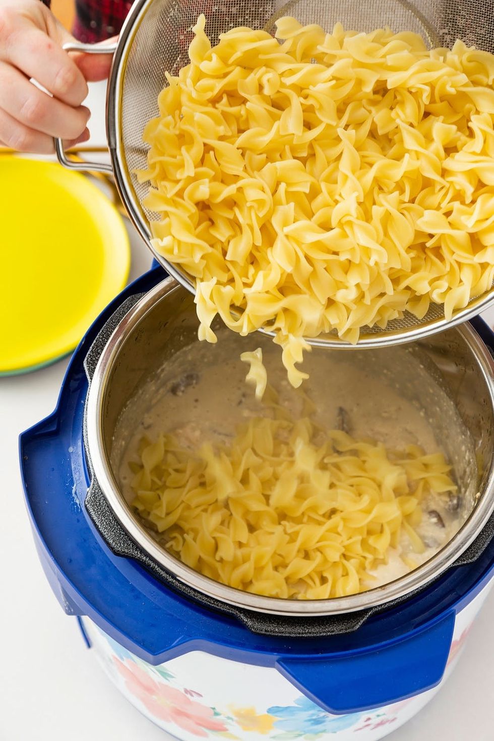Because a lot of her commenters requested an Instant Pot version, we made ours in our beloved Pioneer Woman IP (using the slow-cooker setting). To our surprise, the stroganoff ended up cooking much faster in the IP than in our standard Crock-Pot, which is awesome when you're at home on a Sunday but you should be aware of if you're making it on a weekday. We also stirred in the cream cheese at the very end of the cooking to prevent the sauce from separating and curdling (dairy should always be a last-minute add).