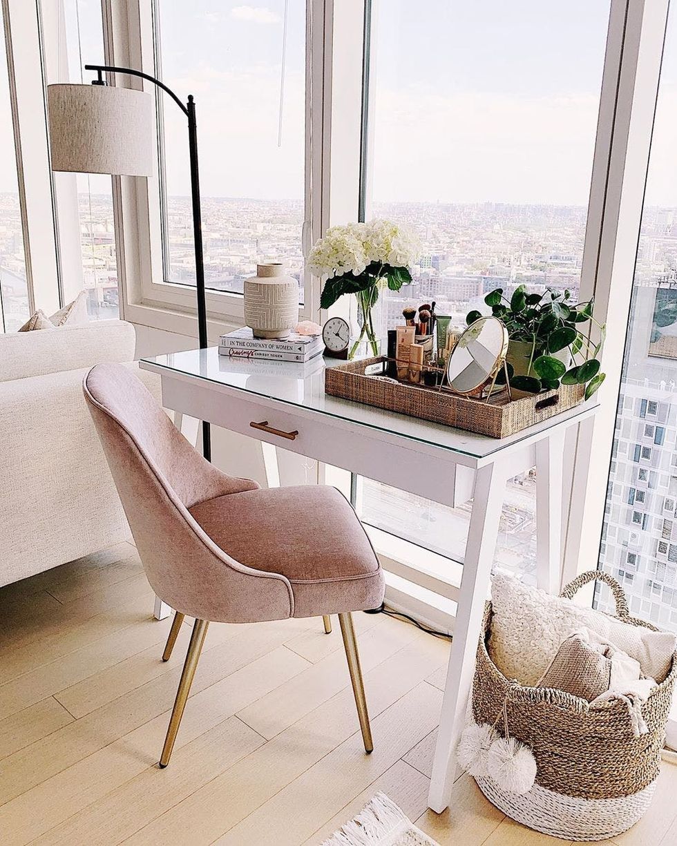 Bring in Blush: Pink's softer counterpart is making waves in the interiors world. Swap your desk chair, add a throw, or go all in with a statement couch to nail this cheery trend that'll look extra cute in your compact digs. (photo via @champagneandsequins)