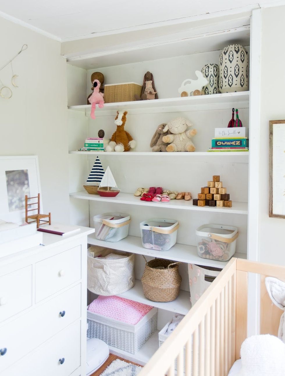 Storage was key, so built-in bookcases came to the rescue. Soon-to-be-beloved toys are on full display, while cute storage baskets and bins disguise more utilitarian items — a system worth using in every room of the house.