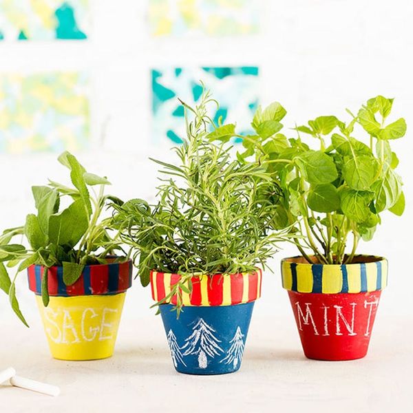 3. Once the paint is dry, draw on the pot with chalk. You could label it with each herb’s name, or draw a pretty forest scene — the options are endless.