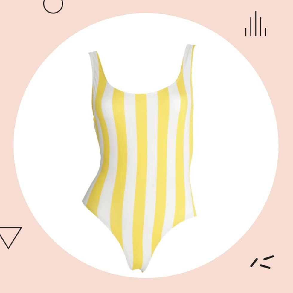 The other suit is a one-piece ($168), also featuring the fun yellow stripes, but this time vertically. The suit also has an extra low scoop back, so it’s definitely not your grandmother’s one-piece!
