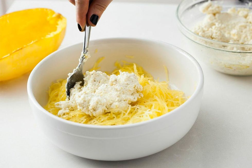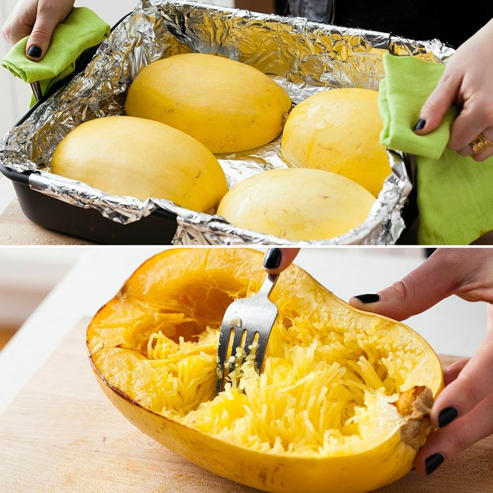1. Preheat the oven to 400 degrees F. Cut spaghetti squash in half lengthwise. Use a spoon to remove the seeds. Drizzle with olive oil and season with salt and pepper.