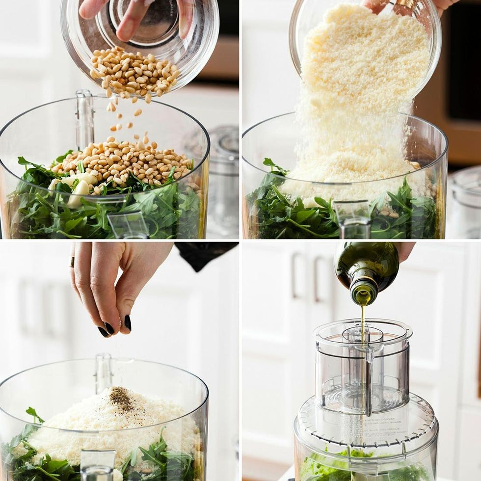 1. Place the arugula, garlic, pine nuts, Parmesan, salt, and pepper in a food processor. Pulse until combined. Slowly stream in the olive oil and continue to pulse. Scrape down the bowl, as needed.