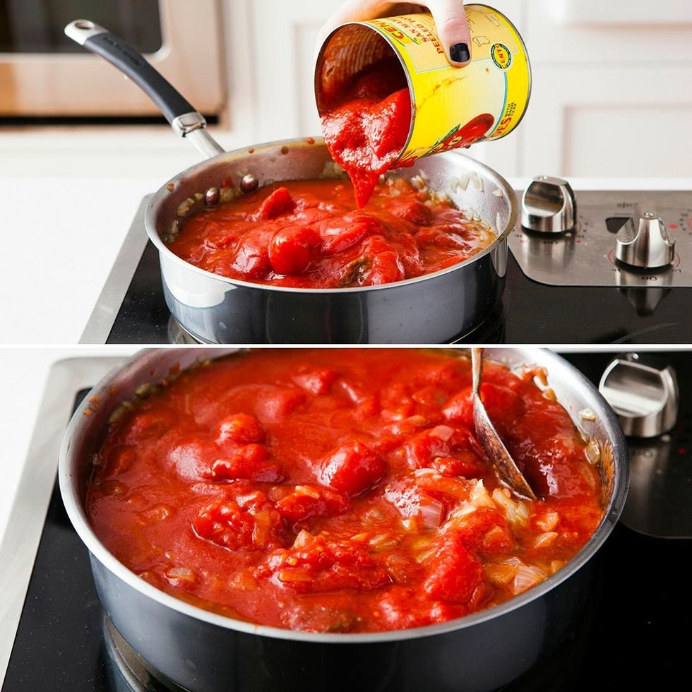 2. Add the tomatoes. Cook, stirring occasionally, for 30-45 minutes. Season with salt and pepper.