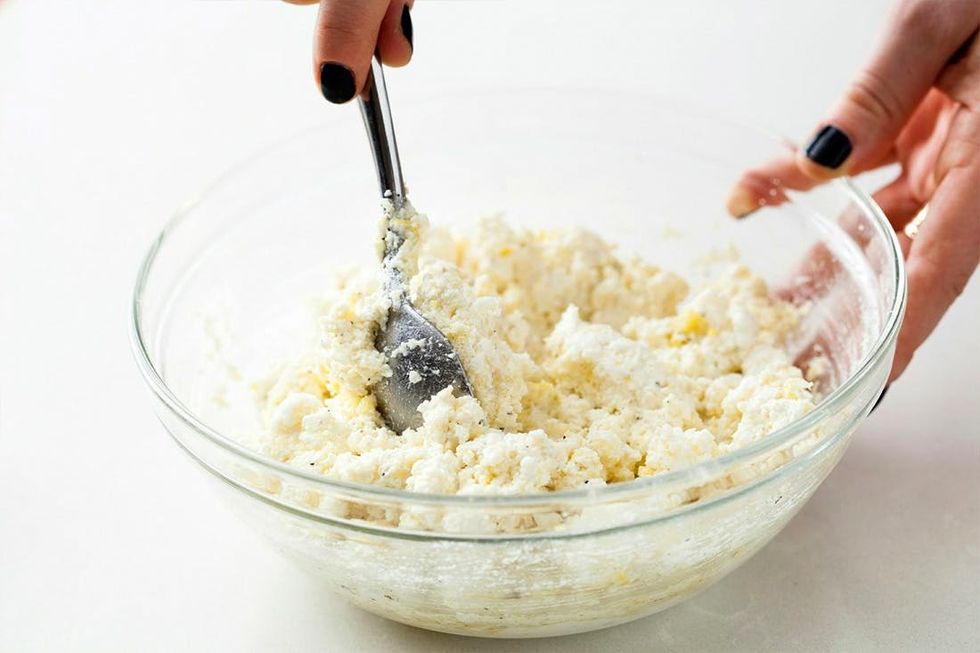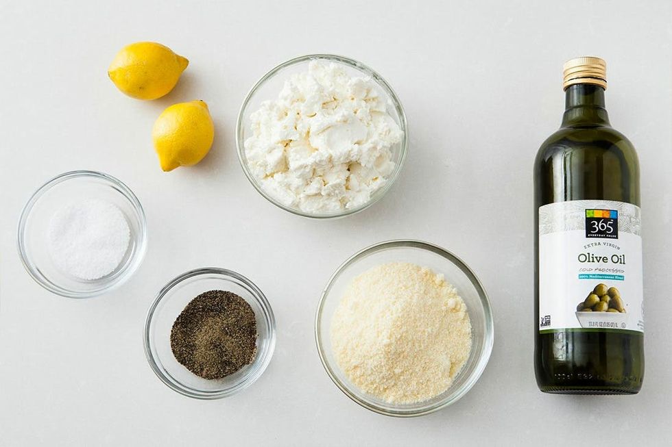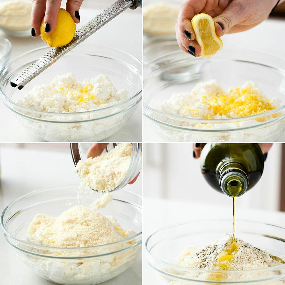 1. In a large bowl, combine the ricotta, lemon zest, lemon juice,Parmesan, salt, pepper, and olive oil. Mix together.