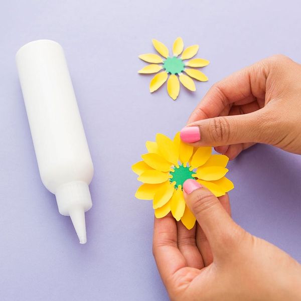 Put together each flower layer one by one and glue in place, then let it dry. Lightly bend each petal for a 3D effect, then glue each flower layer together. Add the disc flower and leaves and set it aside to dry again.