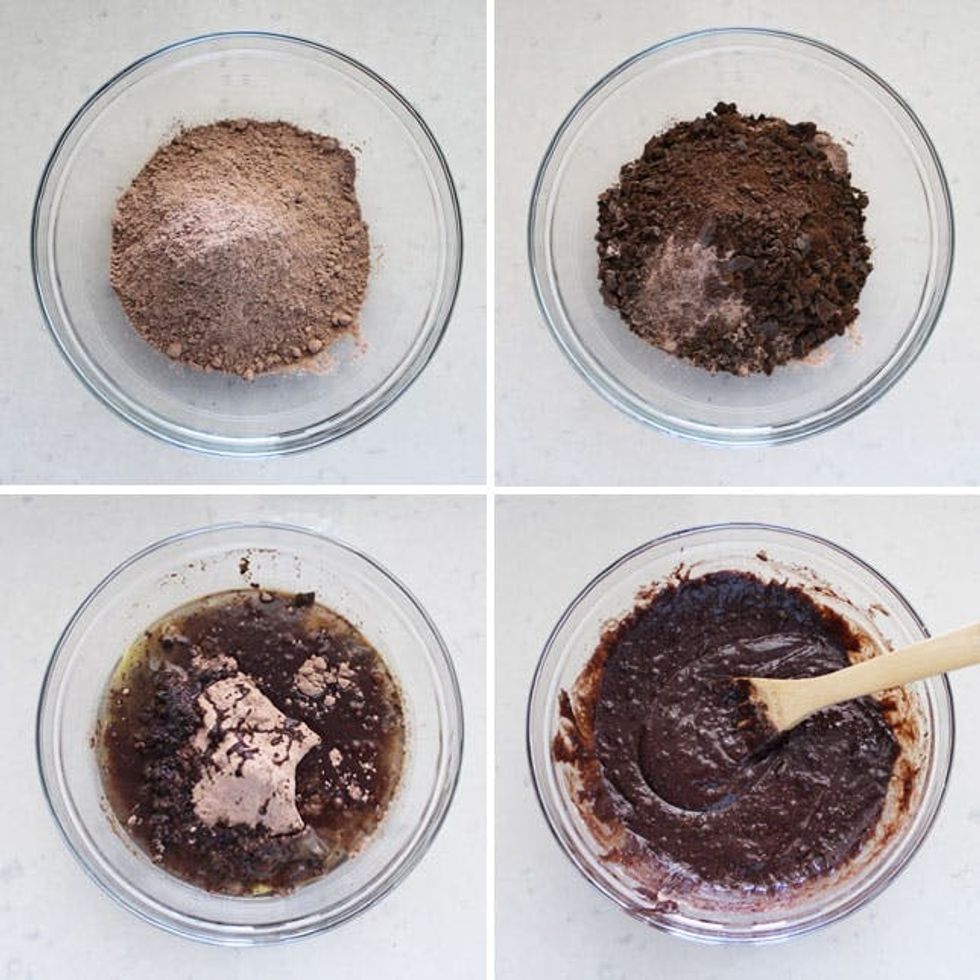 To mix your batter, mix as directed but add an extra egg for a cakier texture. And, of course, add in those Thin Mints crumbs!